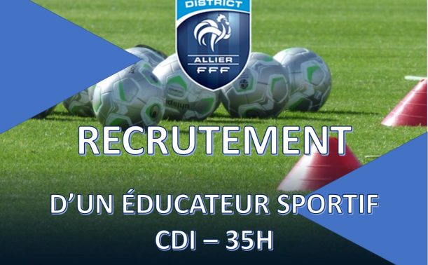 Le District de l’Allier de Football recrute à compter du 25 août 2025, un éducateur sportif su en CDI sur une quotité de 35 heures par semaine. Poste recruté en groupe B de la Convention Collective des personnels administratifs et assimilés du Football et basé à Cosne-d’Allier avec des déplacements à prévoir sur tout le territoire de l’Allier.